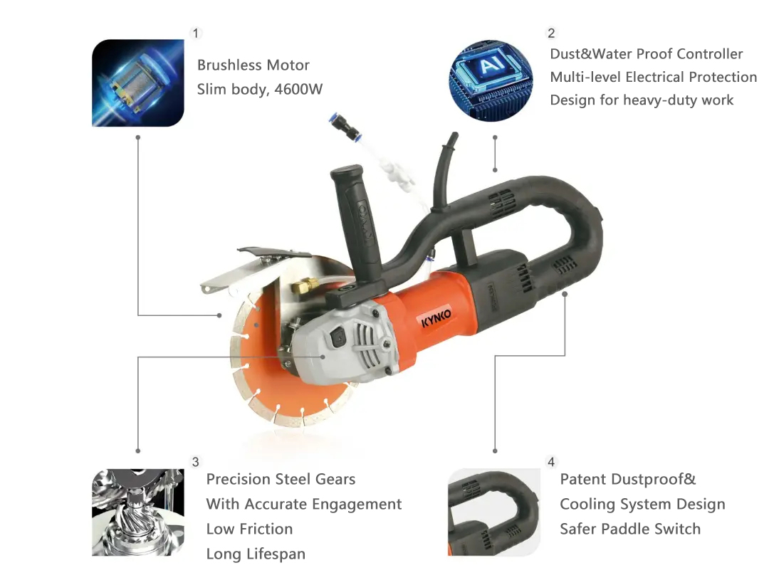 Article du produit : Rainureuse murale sans balais de 180 mm. Puissance de 4600 W avec qualité industrielle. 4600W Forte puissance, adaptée aux travaux intensifs. Largement utilisée pour le rainurage dans les murs en pierre. Conçue et fabriquée par KYNKO Power Tools, qualité garantie.